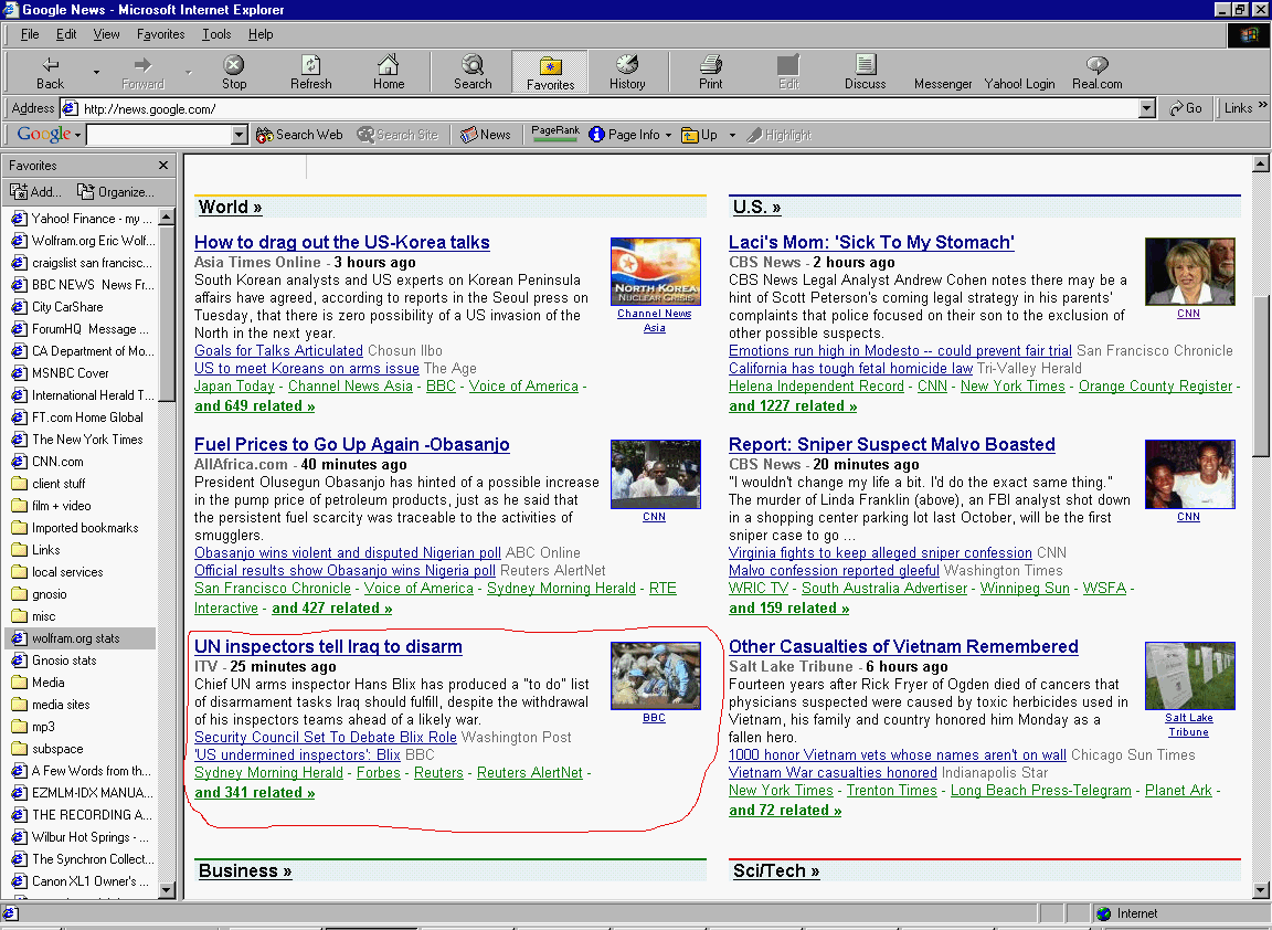 Google News is not perfect. Here is an error in Google News where they're reporting a pre-war Iraq story at least 2 weeks after the war ended -- the story is circled in red along with other current news.